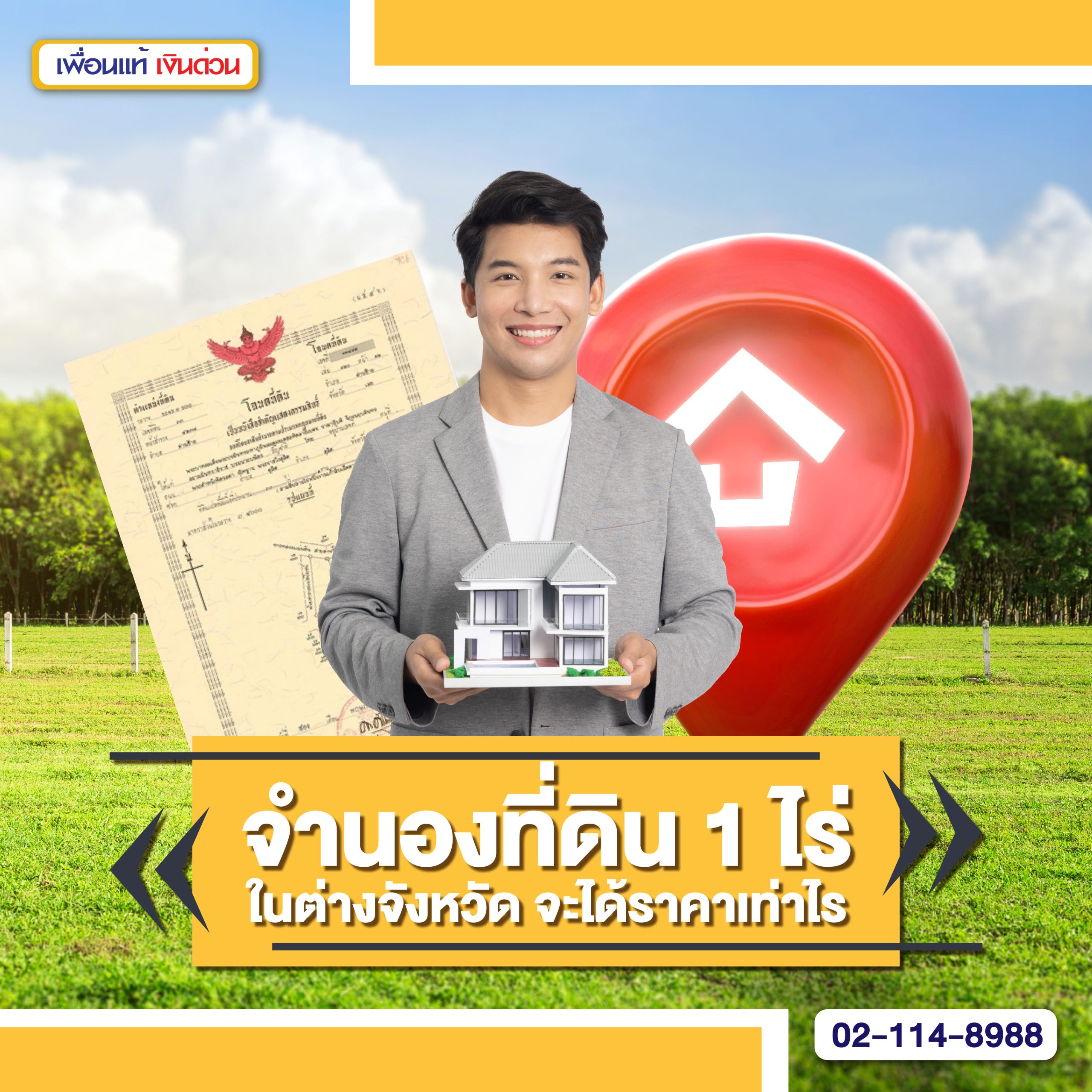 เช่น ที่ดินสวนยาง 1 ไร่ของคุณอยู่ที่จัดหวัดพัทลุง มีราคาประเมินที่ดินของกรมที่ดินอยู่ที่ 100,000 บาทต่อไร่ การจำนองที่ดิน 1 ไร่ กับบริษัท เพื่อนแท้เงินด่วน จำกัด จะได้เงินสูงสุด 130,000 บาทต่อไร่
