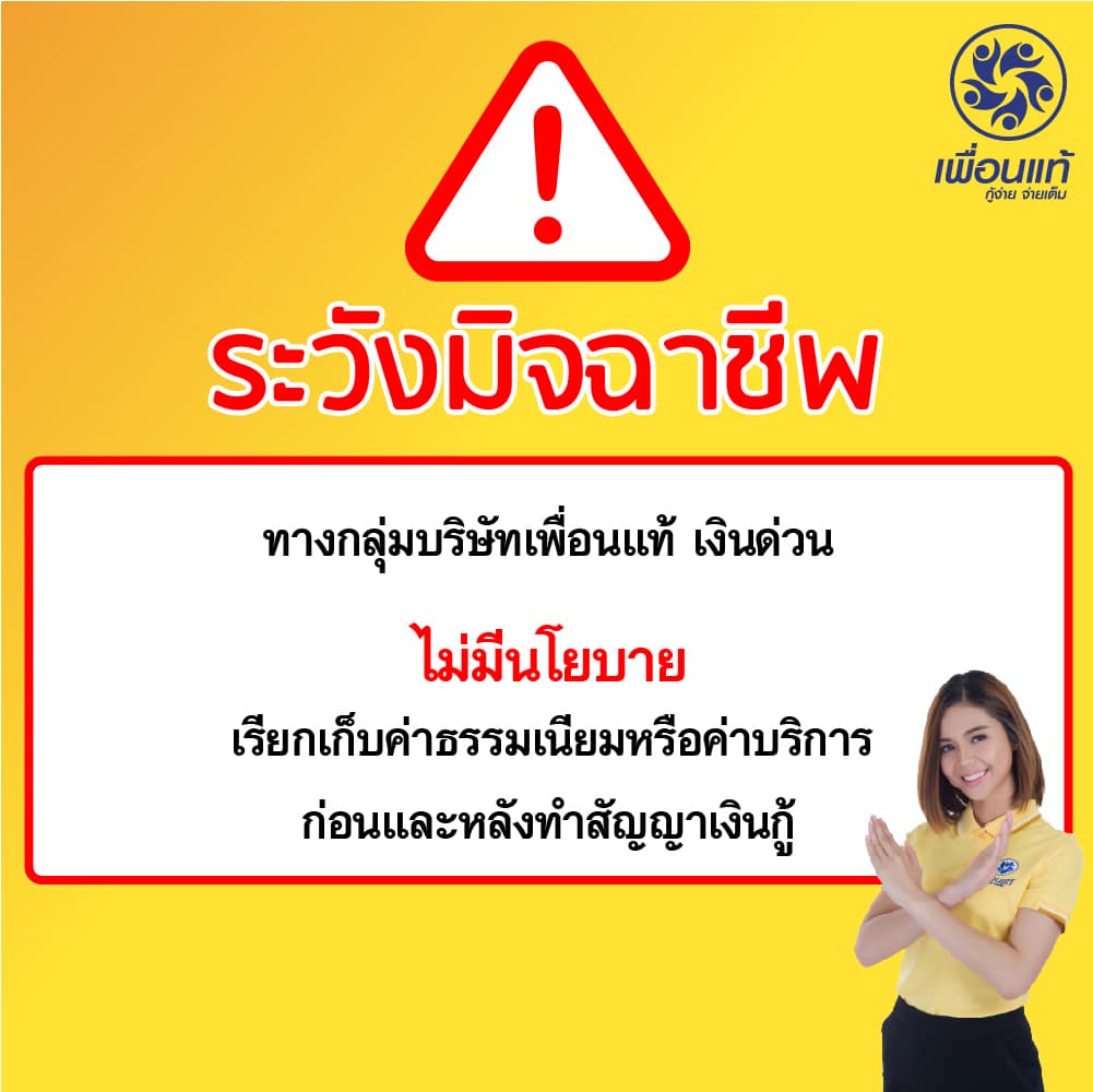 ระวังมิจฉาชีพ ทางกลุ่มบริษัทเพื่อนแท้เงินด่วน ไม่มีนโยบายให้เรียกเก็บค่าธรรมเนียมหรือค่าบริการ ก่อนและหลังทำสัญญาเงินกู้ ถ้ามีมิจฉาชีพโทรให้โอนเงินก่อนทำสัญญา ให้ลูกค้าแจ้งความดำเนินคดีอาญาได้เลย